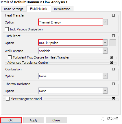 进入Fluid Models标签页,设置Heat Transfer Option为Thermal Energy,指定湍流模型为RNG k-Epsilon,点击OK按钮关闭面板