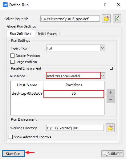 如下图所示设置并行计算参数,指定CPU数量,点击按钮Start Run开始求解计算