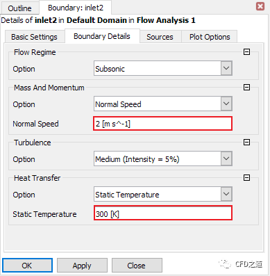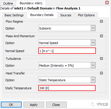 进入Boundary Details标签页,指定Normal Speed为1 m/s,指定Static Temperature为340 K,点击OK按钮关闭对话框