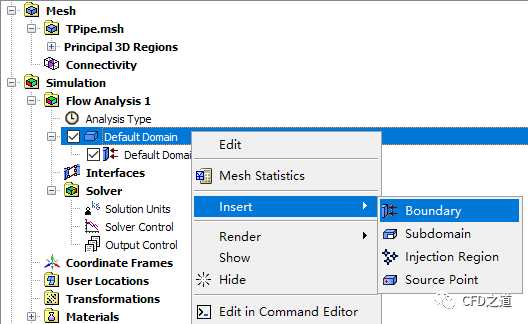 右键选择节点Default Domain,选择弹出对话框Insert → Boundary插入边界