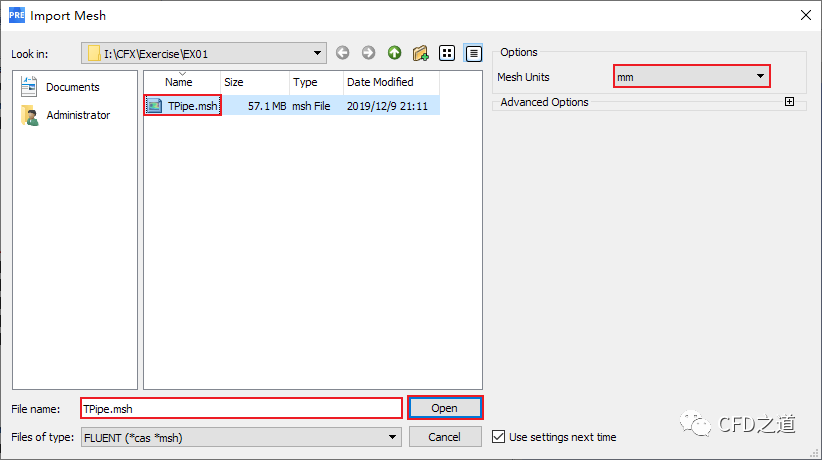 如下图所示选择网格文件TPipe.msh,注意选择网格单位为mm,点击OK按钮导入网格文件