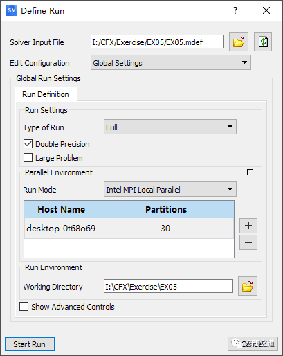 如下图所示设置并行计算参数,指定CPU数量,点击按钮Start Run开始求解计算