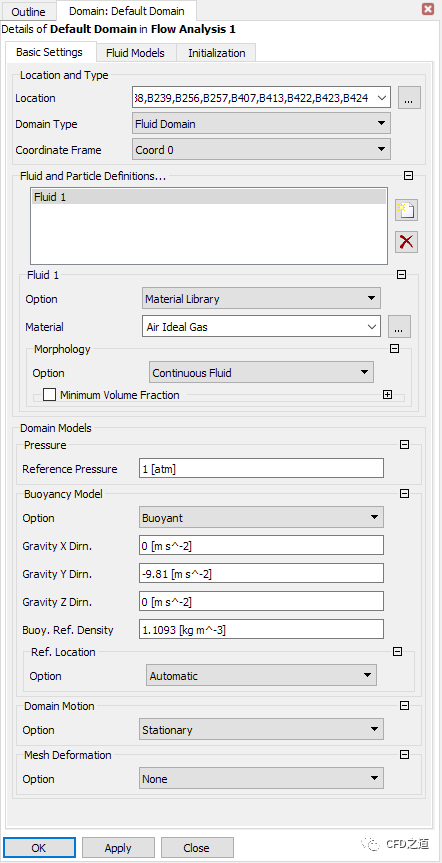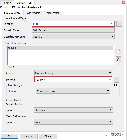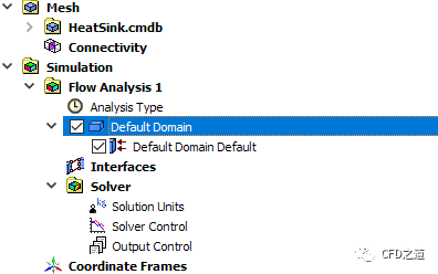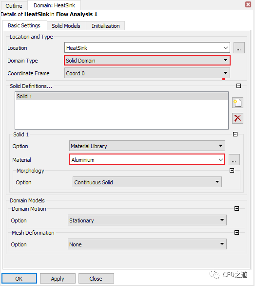 如下图所示指定Location为HeatSink,设置Domain Type为Solid Domain,指定材料介质为Aluminum