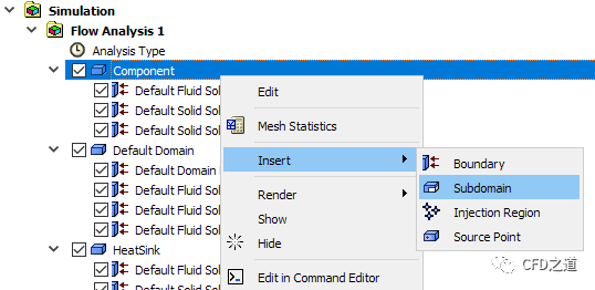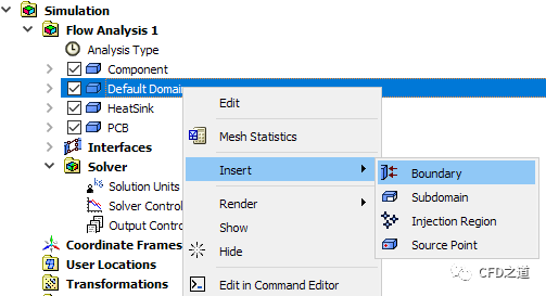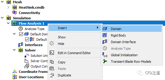 右键选择节点Flow Analysis 1,选择弹出菜单项Insert → Domain插入计算区域