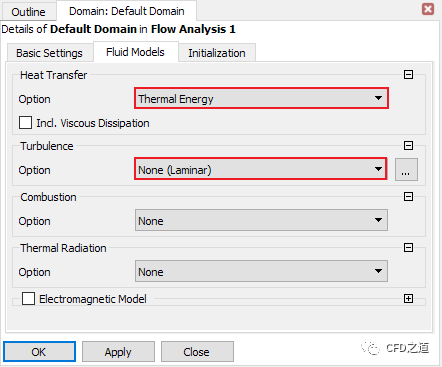 进入Fluid Models标签页,设置Heat Transfer Option为Thermal Energy,指定湍流模型为None(Laminar),点击OK按钮关闭面板