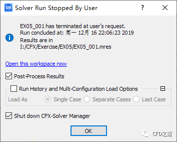 计算完毕后如下图所示,选中选项Post-Process Results,点击OK按钮打开CFD-Post进行后处理