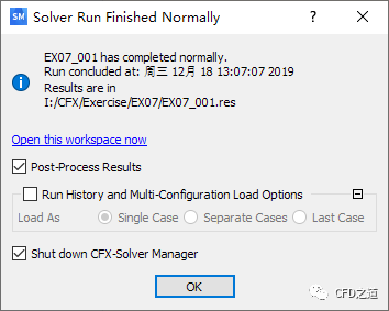 计算完毕后如下图所示,选中选项Post-Process Results,点击OK按钮打开CFD-Post进行后处理