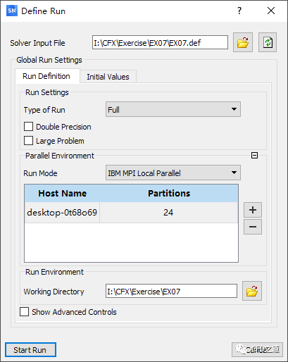 如下图所示设置并行计算参数,指定CPU数量,点击按钮Start Run开始求解计算
