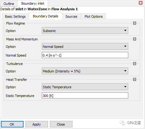 指定入口速度为0.4 m/s,指定温度300 K,如下图所示