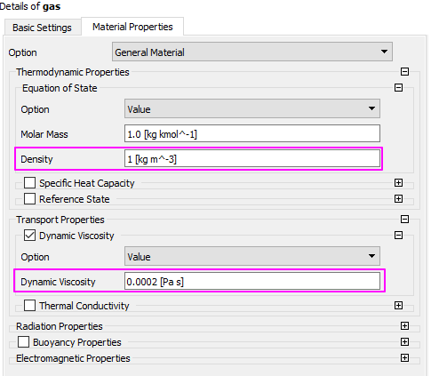 材料设置面板中设置Density为1 kg/m3,设置Dynamic Viscosity为0.0002 Pa.s,如下图所示
