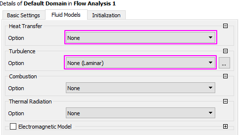 切换到Fluid Models标签页,设置Heat Transfer为None,设置Turbulence为None(Laminar),点击OK按钮关闭面板