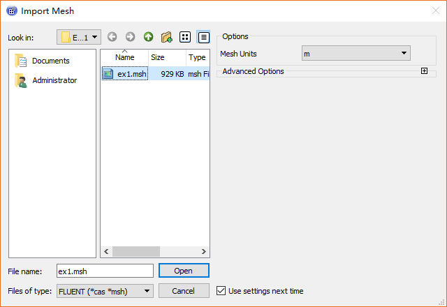 选择菜单File → Import → Mesh,弹出对话框中选择网格文件ex1.msh