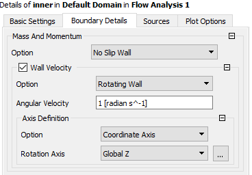 切换中Boundary Details标签页,激活选项Wall Velocity,设置Option为Rotating Wall,指定Augular Velocity为1 rad/s