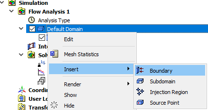 右键选择模型树节点Default Domain,点击弹出菜单项Insert → Boundary插入边界
