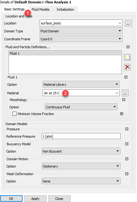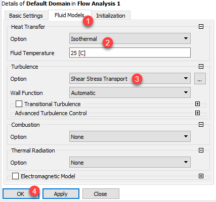 切换到Fluid Models标签页,设置Heat Transfer为IsoThermal,设置Turbulence为Shear Stress Transport,点击OK按钮关闭面板