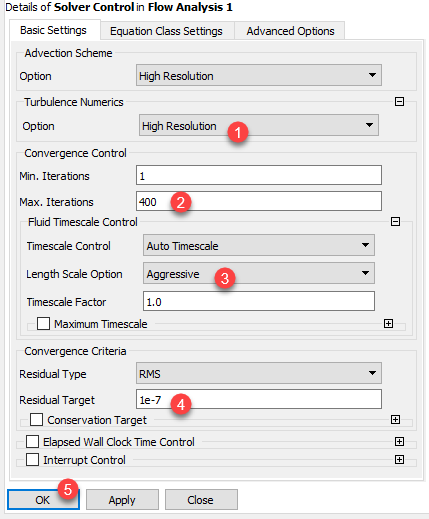 如下图所示的设置面板中,设置Turbulence Numerics Option为High Resolution,设置Max. Iterations为400,设置Length Scale Option为Aggressive,设置Residual Target为1e-7