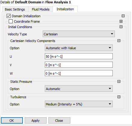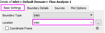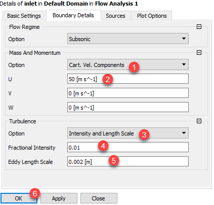 切换至Boundary Details标签页,设置Mass And Momentum指定方式为Cart. Vel. Components,设置U为50 m/s,其他两方向速度为0