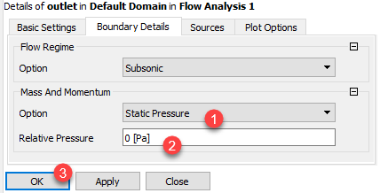 切换至Boundary Details标签页,设置设置Mass And Momentum指定方式为Static Pressure,设置Relative Pressure为0 Pa