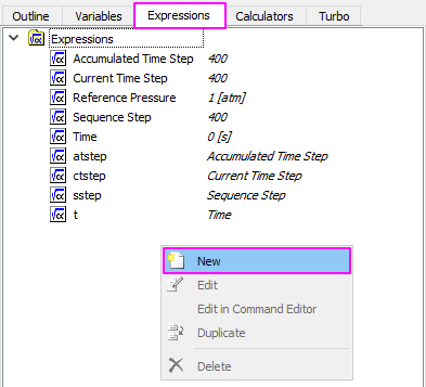 CFD-Post中左侧模型面板中切换至Expressions标签页,在任意空白位置点击鼠标右键,选择弹出菜单项New新建表达式