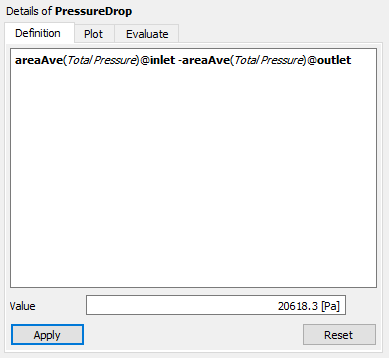 输入表达式areaAve(Total Pressure)@inlet -areaAve(Total Pressure)@outlet,点击按钮Apply,则Value显示为计算结果。