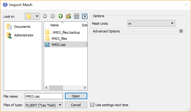 选择菜单File → Import → Mesh,弹出对话框中选择网格文件VM03.cas