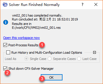 计算完毕后弹出提示对话框,激活选项Post-Process Results及Shut down CFX-Solver Manager,点击OK按钮启动CFD-Post