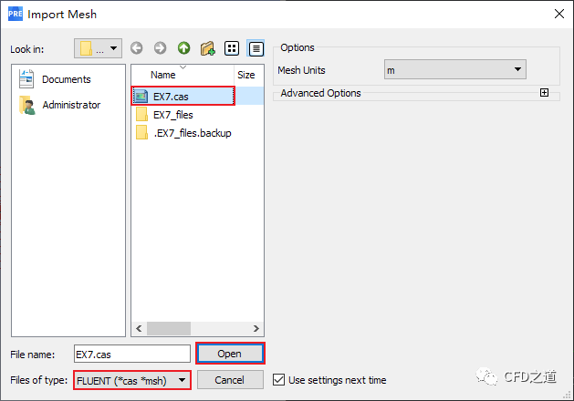 选择菜单File → Import → Mesh,弹出对话框中选择网格文件EX7.cas
