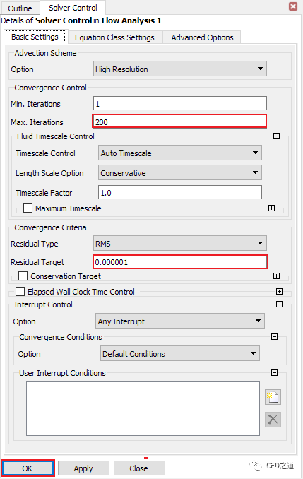 如下图所示的设置面板中,设置Min. Iterations为100,设置Max. Iterations为500,设置Residual Target为1e-6
