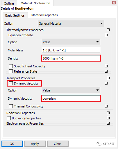 如下图所示设置材料密度为1000 kg/m3,设置动力粘度为powerlaw