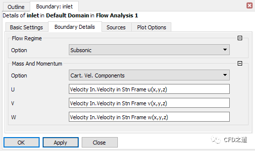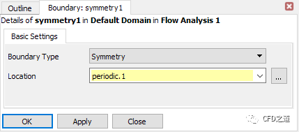 注:CFX读入Fluent的二维cas文件后会多出一些边界面,必须将其设置为对称面。剩下未定义的面默认为wall边界,本案例采用默认设置。