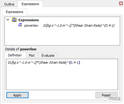 如下图所示插入表达式 10[kg s^-1.6 m^-1]*(Shear Strain Rate)^(0.4-1)