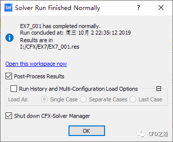 计算完毕后弹出提示对话框,激活选项Post-Process Results及Shut down CFX-Solver Manager,点击OK按钮启动CFD-Post