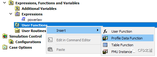 右键选择模型树节点User Functions,点击弹出菜单项Insert → Profile Data Function