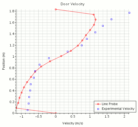 模拟的速度分布与高达 1.5m 的实验数据基本一致。这点之后,实验数据指明,边界层中的最大速度高于模拟预测值。产生这一差异的一个原因可能是门口上部区域的网格单元的密度不足。良好的模拟做法是将体网格的基础尺寸减至 0.05 m,然后重构域并使用更加精细的网格重新运行模拟。使用更加精细的网格尺寸会使模拟结果和实验结果更一致。