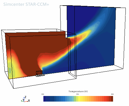 以下场景显示了在 300K 至 400K 的温度范围内绘制的 400 个时间步后的求解。