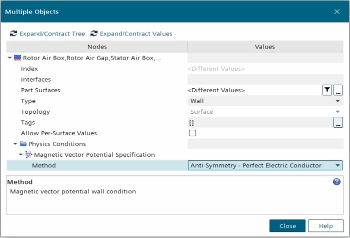 In the Multiple Objects dialog, expand the and set Method to Anti-Symmetric - Perfect Electric Conductor.