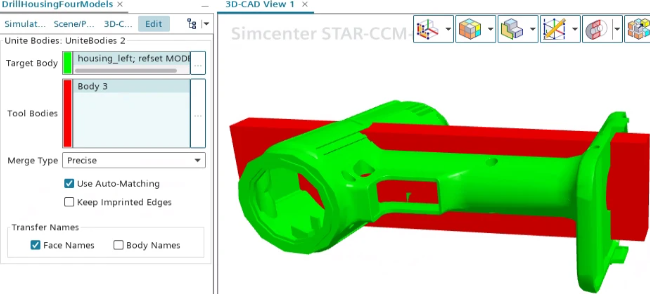 | Use Auto-Matching | When activated, allows the Parasolid function to automatically identify matched regions (areas of near coincidence) between the target and tool bodies. When deactivated, Simcenter STAR-CCM+ identifies the matched regions and passes them to the Parasolid function. | |