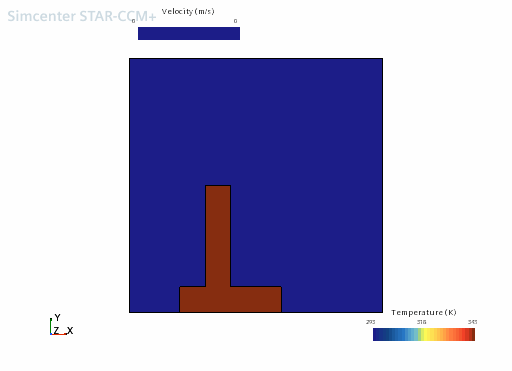 如颜色所示,固体翼片温度为 343 K,而周围空气温度为 293 K。各网格单元的速度值为 0。现在就可以运行模拟了。