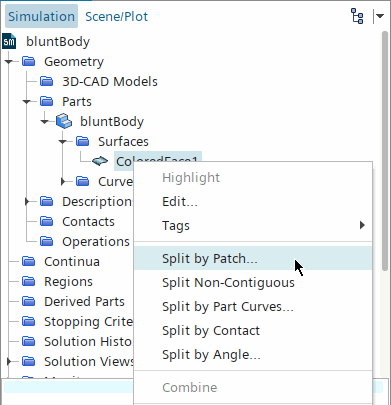 最初,整个导入的表面属于一个零部件表面。使用几何零部件右键菜单中的拆分操作,可以从导入的表面中选取基础块,并为边界条件形成不同的零部件表面。