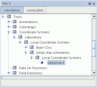 对于局部坐标系具有一个或多个嵌套级别的情况,使用限定符 @CoordinateSystem,并且使用 . 字符将每个坐标系与其父进行分隔。例如,考虑在以下模拟树的 Spherical 1(球 1) 局部坐标系中给定位置的场函数: