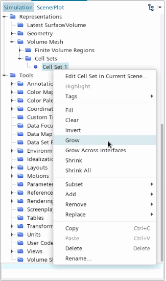 要访问网格单元集增长选项,右键单击所需网格单元集节点,然后选择弹出菜单中的: