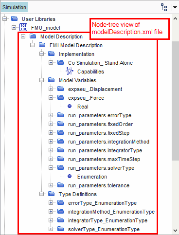 - 采用 XML 格式的 FMI 定义文件 ( modelDescription.xml),其中包含 FMU 的常规静态信息,具体包括实施详细信息、模型标量变量和类型定义。Simcenter STAR-CCM+ 提供此文件的便利节点树表示,可用于检查 FMU 模型详细信息: