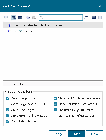 在标记部件曲线选项对话框中,定义部件曲线选项,单击应用,然后单击关闭。