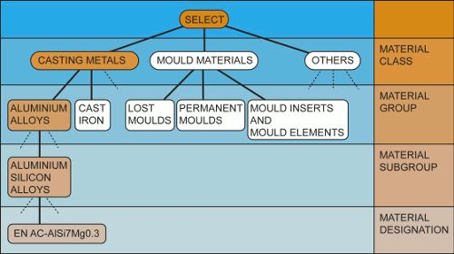 In the Casting Material Database, casting materials are categorized according to the tree structure shown below: