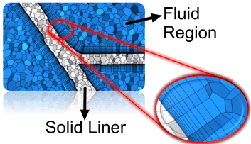 - 当使用共轭热传递对燃烧建模时,在交界面创建共形网格。还需要通过使用棱柱层网格生成器创建壁面旁边的正交棱柱体网格单元,来捕捉边界层。