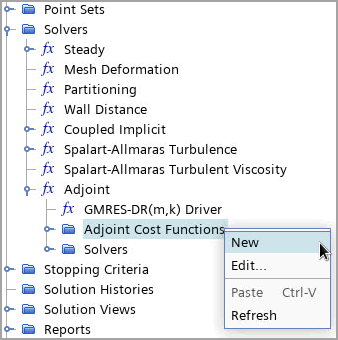 创建伴随成本函数 伴随成本函数指定作为灵敏度分析对象的工程量。 在本教程中,您将了解如何增加机翼产生的下压力。力成本函数提供该信息。 要创建力成本函数: 右键单击求解器 > 伴随 > 伴随成本函数节点,然后选择新建。 创建报告子节点。 将成本函数报告重命名为下压力。 选择下压力节点,然后将报告设为下压力。 伴随成本函数在监视器节点中增加了下压力::残差监视器: