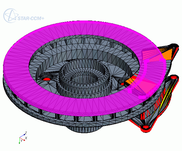 相邻表面上刹车片的所有顶点和制动盘的面被选中: