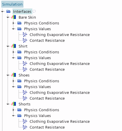 要区分裸漏皮肤和衣服,为表示裸露皮肤的部件表面(如头部和手)以及用衣服覆盖的部件表面分别创建交界面。在本教程中,还为不同的服装项指定不同的服装蒸发阻力和接触阻力值,因此,需要为每一项创建单独的交界面。