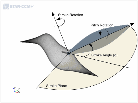 在前进和返回冲程期间,机翼运动被限制在一个平面(冲程平面)内。冲程角 定义了冲程平面上的机翼位置,它随时间协调变化,变化幅度为 70°。