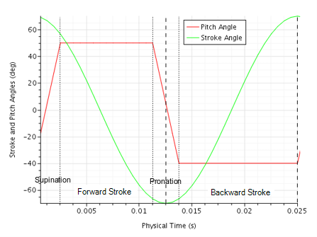 在冲程反转期间,机翼围绕其纵轴旋转以保持正迎角。前进冲程之前的俯仰旋转称为旋后;返回冲程之前的俯仰旋转称为内旋。在本教程使用的模型中,俯仰角 定义了迎角,它在旋后和内旋期间随时间线性变化,然后在下次反转前一直保持恒定。